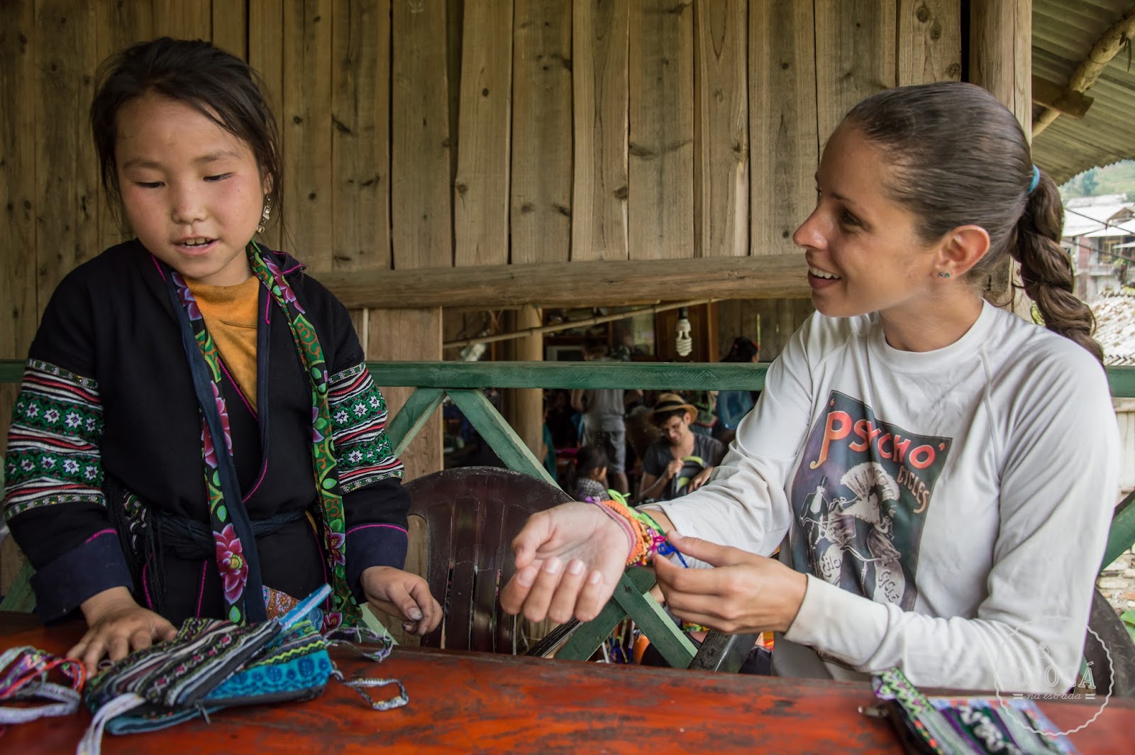 Existem vários grupos étnicos nessa região, tem até um povoado que fala uma língua diferente do vietnamita. O povo Hmong, que mora lá nas montanhas, principalmente as mulheres, vestem roupas típicas, coloridas. Lembram muito as peruanas. Eles plantam cânhamo para a produção de tecidos. Lá estavam elas nos esperando para vender alguma coisa. Elas andam com os nenenzinho nas costas, coisa mais linda. Fomos para o hotel, descansamos e já fomos para o primeiro rolé.